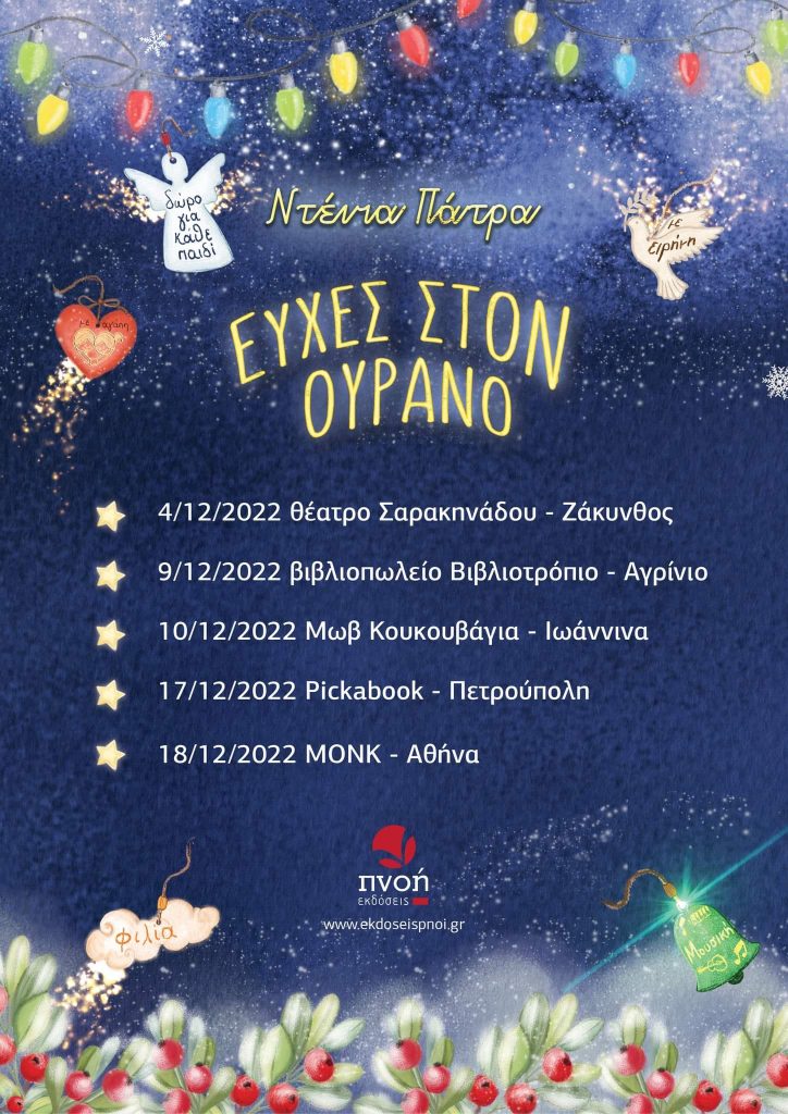 Το πρόγραμμα των παρουσιάσεων του νέου μου βιβλίου είναι έτοιμο. Με πολλή χαρά περιμένω να ανταλλάξουμε ευχές που φτάνουν μέχρι τον ουρανό με μικρά και μεγαλύτερα παιδιά!